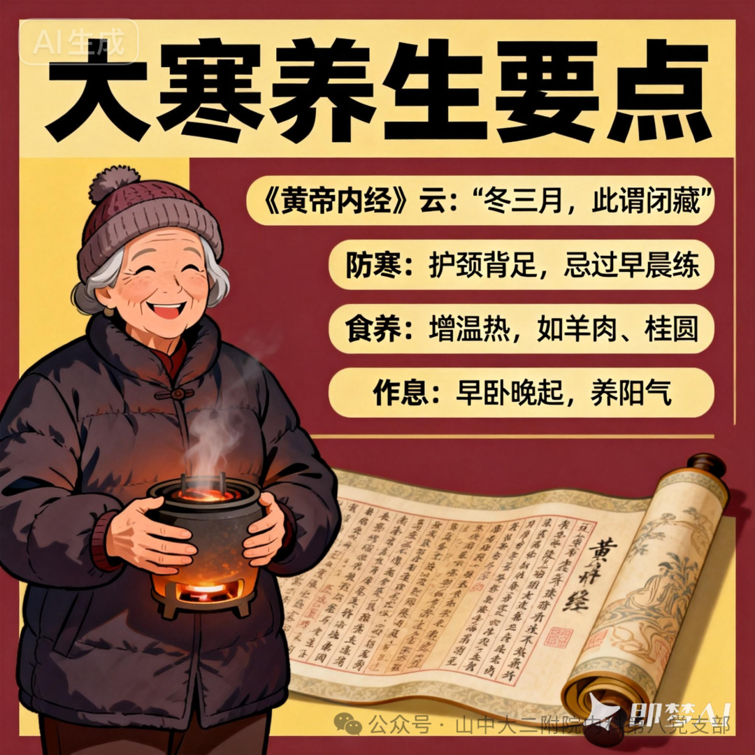 “大寒到顶点,日后天渐暖”,作为二十四节气中最后一个节气,大寒是一年中寒气最盛的时节。此时阳气内敛、阴寒极盛,老年人因基础代谢降低、免疫功能减弱、血管弹性变差,更易受寒邪侵袭,诱发心脑血管、呼吸道等疾病。遵循“固护阳气、御寒藏精、兼以润燥”的原则,从以下五个方面做好调养,才能安稳度过寒冬,为开春阳气生发积蓄力量。