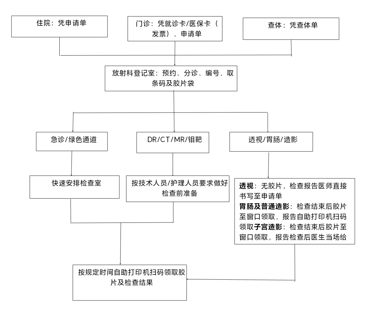 放射科就诊流程及报告获取方式 2025-10-20 19:49放射科 放射科就诊流程 放射科报告获取时间: 急诊/绿色通道:检查结束半小时后领取结果。 门诊检查:检查结束两小时后领取结果。 住院患者:上午的检查下午六点后领取结果,下午的检查第二天上午十点后领取结果;特殊疑难病例,科室会诊后发报告。 查体:报告及胶片返回至查体中心,具体请咨询查体中心。 放射科报告获取方式:门诊和住院楼登记窗口附近的自助打印设备。 撰稿人:放射科