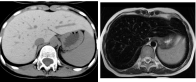 图片说明:肝脏铁过载患者,CT(左图)肝脏密度弥漫增高(白肝),MRI(右图)T2WI肝脏信号弥漫减低(黑肝)