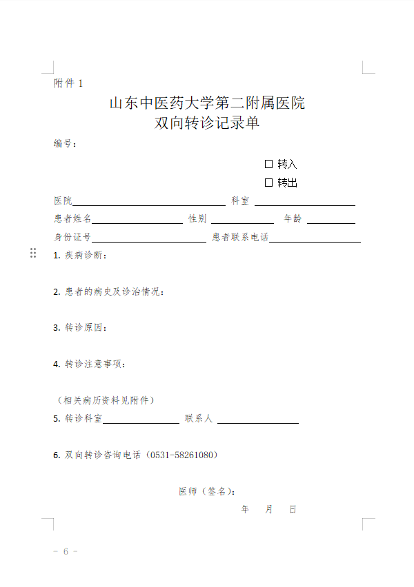 附件1:《山东中医药大学第二附属医院双向转诊记录单》
