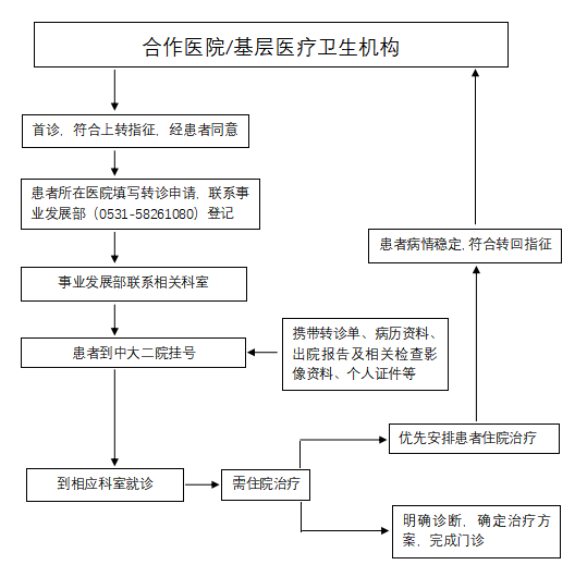 (二)设立专线电话(0531-58261080),指定专人为合作医院医务人员和转诊患者提供咨询、远程预约会诊、预约转诊、推荐专家等服务。