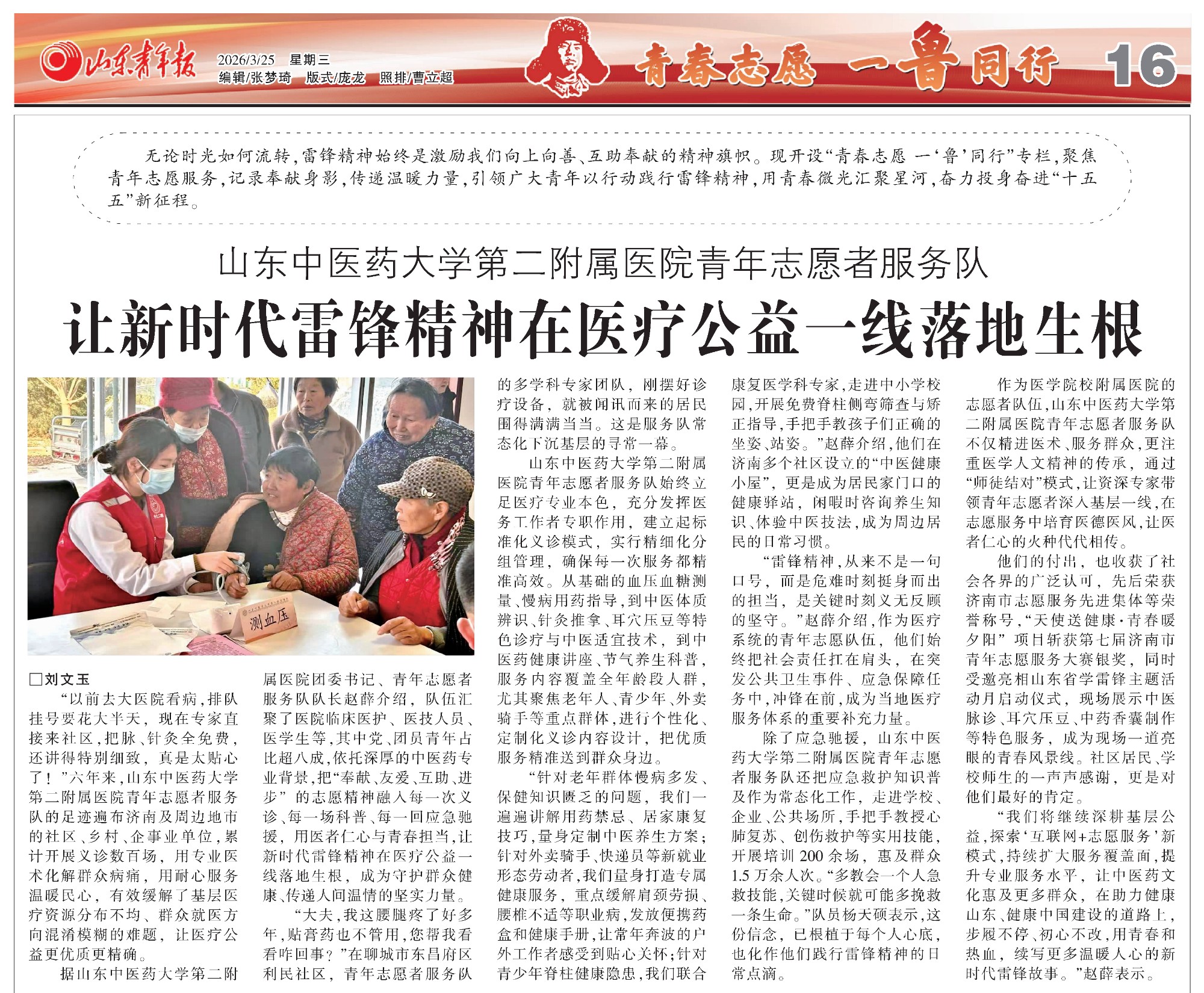 【山东青年报】山东中医药大学第二附属医院青年志愿者服务队——让新时代雷锋精神在医疗公益一线落地生根-媒体报道-新闻中心-员工版-山东中医药大学第二附属医院【官方网站】