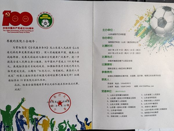 近日,我院工会受山东省医疗足球联盟邀请,在工会主席丛文带领下,率队出战主题为“红色之心,为党献礼,展医疗人员风采”的第三届驻济医疗联盟五人制足球邀请赛。比赛共邀请了包括我院在内的15家医院卫生机构的足球队同台竞技。比赛分为小组赛与淘汰赛两阶段。