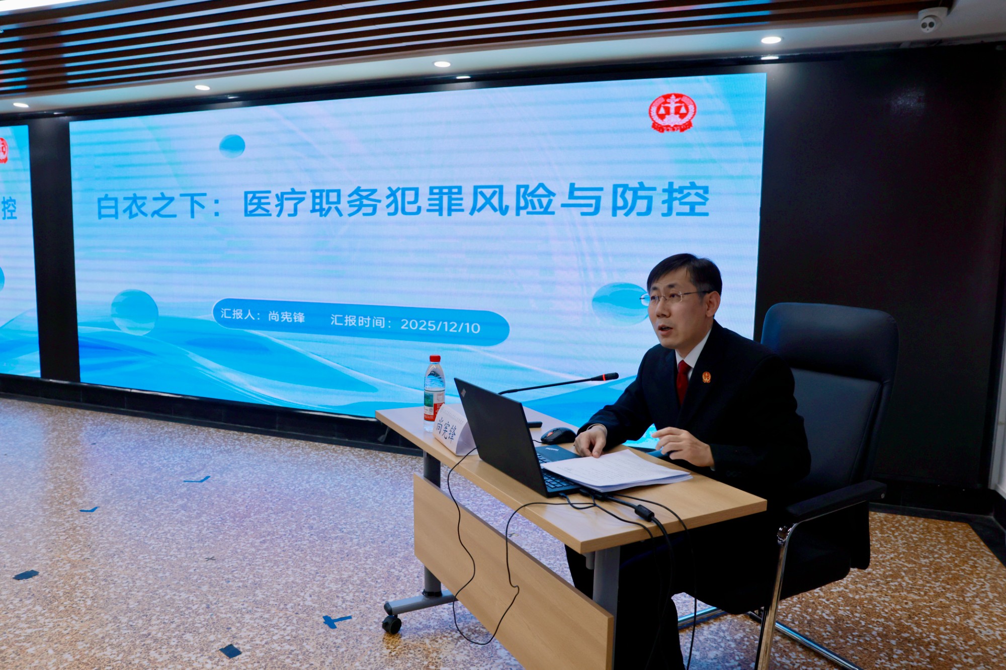 为贯彻医疗卫生行业作风建设要求,筑牢医务人员廉洁思想防线,增强法治与风险防范意识,12月10日下午,医院邀请济南市章丘区人民法院刑事审判庭庭长尚宪锋来院,开展“医疗职务犯罪风险与防控”专题讲座,院长李刚主持本次讲座。医院领导班子成员、各职能部门负责人、临床医技科室主任、护士长等150余人参加。