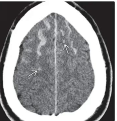 图片说明:男,26Y,外伤后,皮质下多发出血灶(白色箭头所示),蛛网膜下腔出血