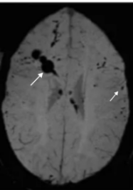 图片说明:男,37Y,SWI可见脑内多发点片状低信号(白色箭头所示)。
