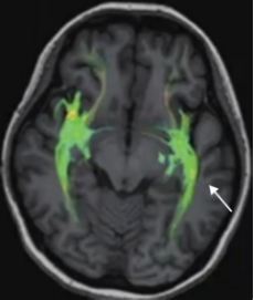 图片说明:女,26Y,DTI示左侧丘脑、脑干区白质纤维束明显减少(白色箭头所示)。